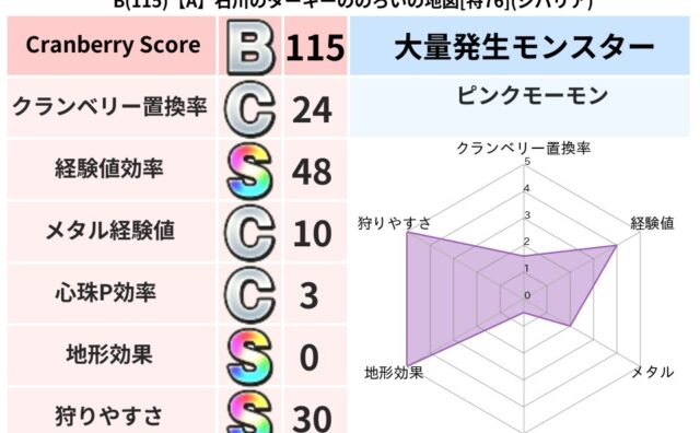 クランベリーボット判定結果の詳細クランベリースコア115クランベリー置換率24%大量発生モンスターピンクモーモン超耐性ジバリア(0%)系統狩り悪魔系49%こころ道 完全一致モンスターピンクモーモン魔剣士(刃道Lv5)ねこまどうニンジャ(風道...