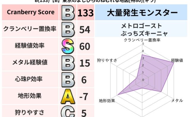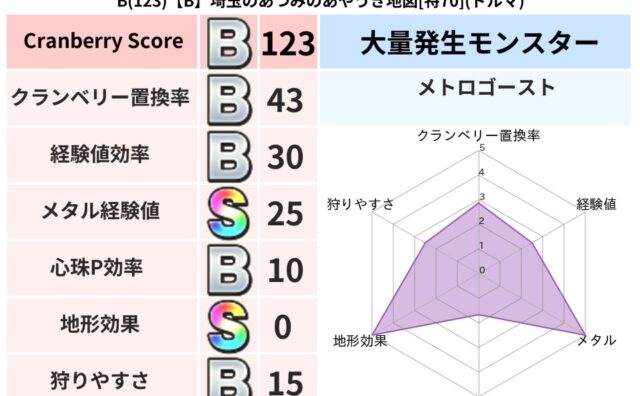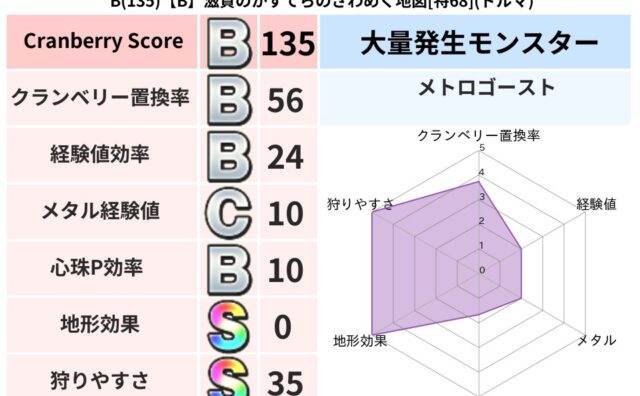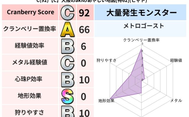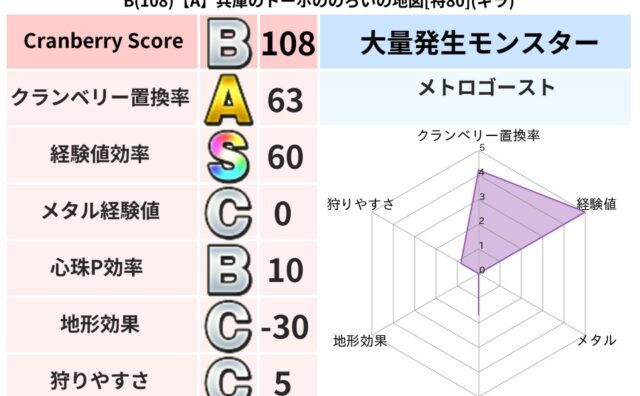 クランベリーボット判定結果の詳細クランベリースコア103クランベリー置換率63%大量発生モンスターメトロゴースト超耐性デイン(38%)系統狩りゾンビ系41%こころ道 完全一致モンスターしりょうのきし大神官(舞道Lv5)キャットフライニンジャ...
