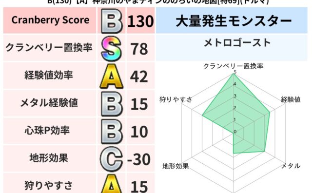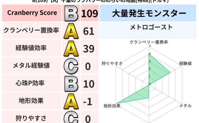 クランベリーボット判定結果の詳細クランベリースコア:109クランベリー置換率:61%大量発生モンスター:メトロゴーストドルマ超耐性(1%)こころ道 完全一致モンスターさまようよろいゴッドハンド(守護道Lv5)ギズモ天地雷鳴士(共通Lv1)ス...