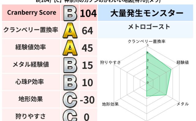 クランベリーボット判定結果の詳細クランベリースコア78クランベリー置換率81%大量発生モンスターメトロゴースト超耐性メラ(44%)こころ道 完全一致モンスターかっちゅうアリ魔人(共通Lv1)ストーンマンゴッドハンド(守護道Lv5)しましまキ...