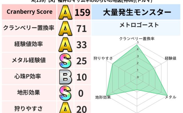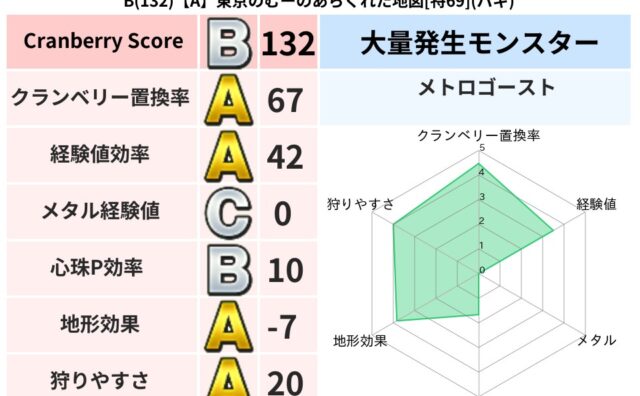 クランベリーボット判定結果の詳細クランベリースコア132クランベリー置換率67%大量発生モンスターメトロゴースト超耐性バギ(6%)超耐性・弱耐性なしデインドルマ系統狩りゾンビ系41%こころ道 完全一致モンスターキメラ大魔道士(共通Lv1)ど...
