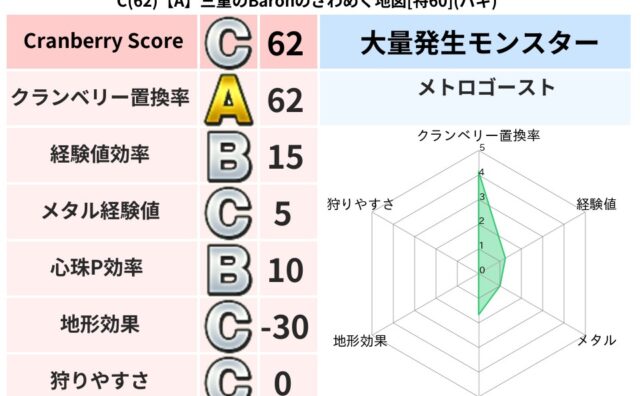 クランベリーボット判定結果の詳細クランベリースコア:167クランベリー置換率:66%大量発生モンスター:メトロゴーストイオ超耐性(0%)超耐性・弱耐性なし:ジバリア系統狩り(59%)こころ道 完全一致モンスターさまようよろい: ゴッドハンド...