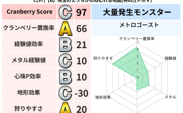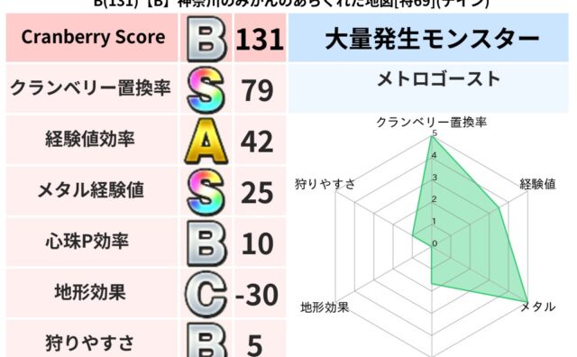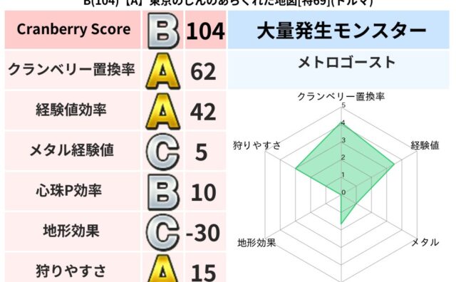 クランベリーボット判定結果の詳細クランベリースコア104クランベリー置換率62%大量発生モンスターメトロゴースト超耐性ドルマ(49%)超耐性・弱耐性なしバギ系統狩りゾンビ系40%こころ道 完全一致モンスターみならいあくまニンジャ(風道Lv5...