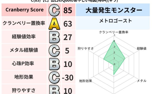 クランベリーボット判定結果の詳細クランベリースコア65クランベリー置換率62%大量発生モンスターメトロゴースト,ぶっちズキーニャ超耐性ギラ(73%)こころ道 完全一致モンスターがいこつ魔剣士(共通Lv1)ギズモ天地雷鳴士(共通Lv1)フレイ...