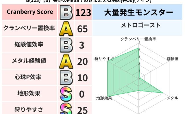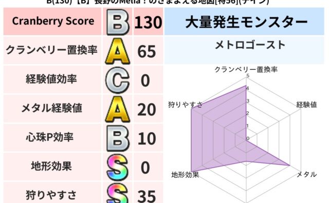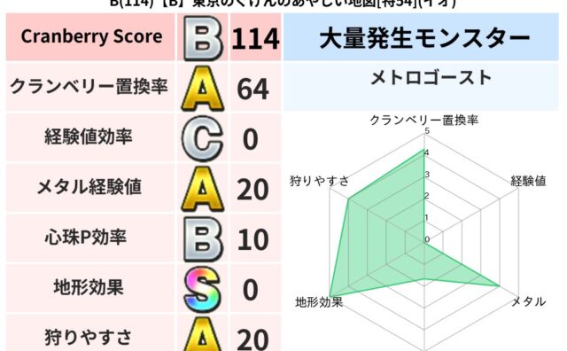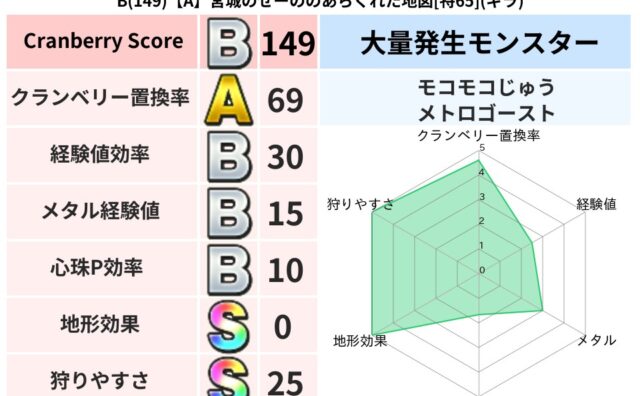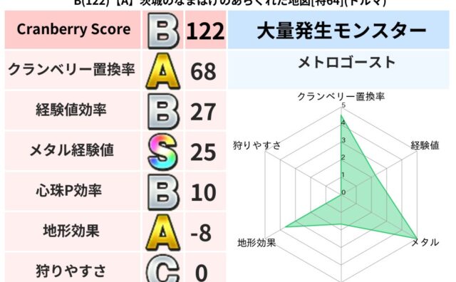 クランベリーボット判定結果の詳細クランベリースコア:114クランベリー置換率:64%大量発生モンスター:メトロゴーストイオ超耐性(0%)系統狩り(58%)こころ道 完全一致モンスターくさった死体ゴッドハンド(守護道Lv5),大魔導士(魔力道...
