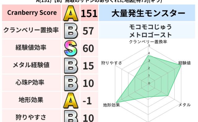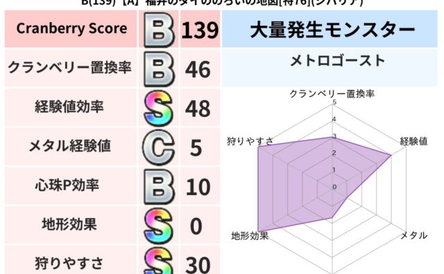 クランベリーボット判定結果の詳細クランベリースコア139クランベリー置換率46%大量発生モンスターメトロゴースト超耐性ジバリア(0%)こころ道 完全一致モンスターねこまどうニンジャ(風道Lv5)グリゴンダンス魔人(超魔道Lv5)メトロゴース...