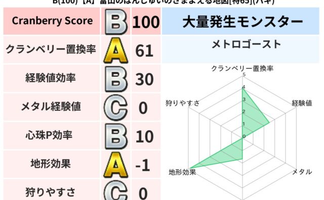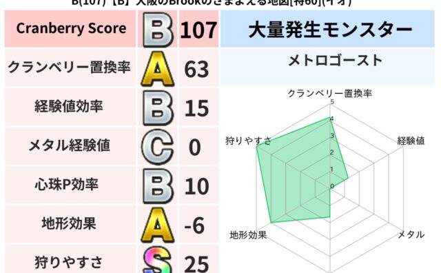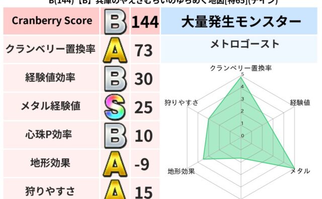 クランベリーボット判定結果の詳細クランベリースコア:122クランベリー置換率:63%大量発生モンスター:メトロゴーストイオ超耐性(0%)系統狩り(40%)こころ道 完全一致モンスターギズモ: 天地雷鳴士(共通Lv1)しりょうのきし: 大神官...
