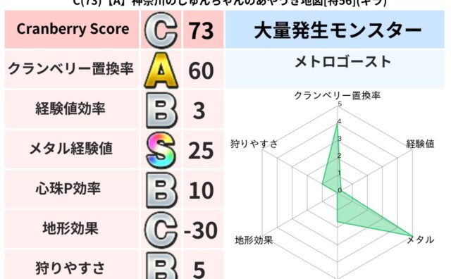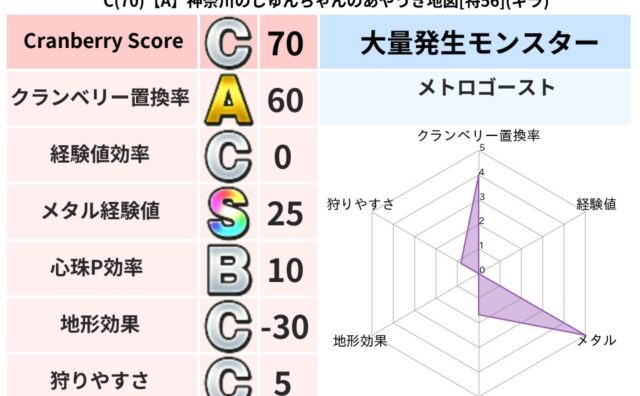 クランベリーボット判定結果の詳細クランベリースコア:89クランベリー置換率:63%大量発生モンスター:メトロゴーストメラ超耐性(8%)こころ道 完全一致モンスターデビルアーマー大神官(舞道Lv5)フロストギズモ魔剣士(魔道Lv5)キラーパン...