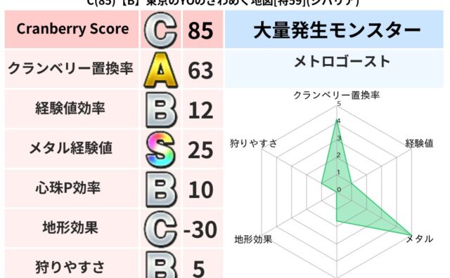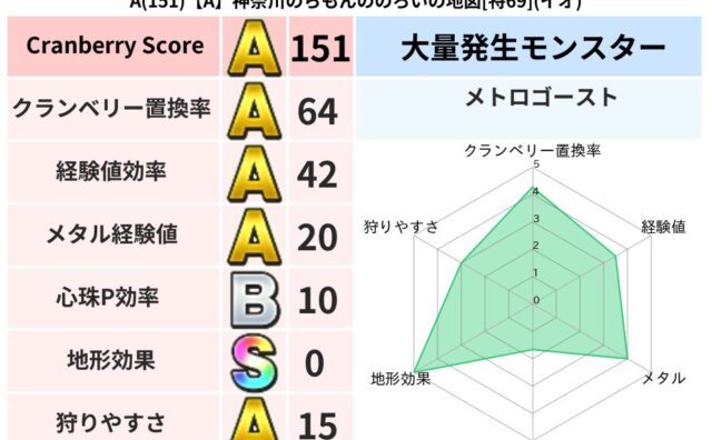 クランベリーボット判定結果の詳細クランベリースコア:114クランベリー置換率:64%大量発生モンスター:メトロゴーストジバリア超耐性(46%)超耐性・弱耐性なし:ドルマ系統狩り(41%)こころ道 完全一致モンスターがいこつ魔剣士(共通Lv1...