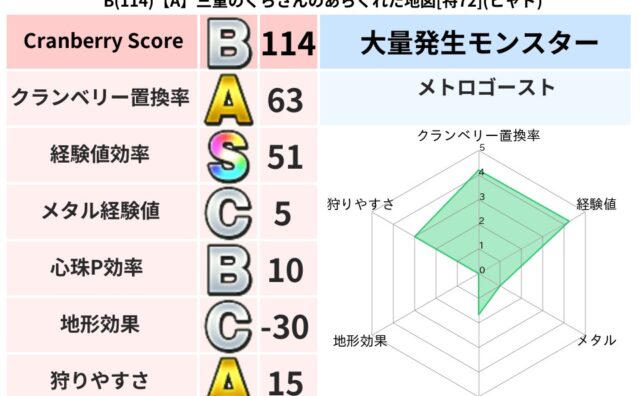 クランベリーボット判定結果の詳細クランベリースコア:114クランベリー置換率:43%大量発生モンスター:メトロゴーストヒャド超耐性(8%)超耐性・弱耐性なし:バギ,デインこころ道 完全一致モンスターどくろあらい: ゴッドハンド(守護道Lv5...