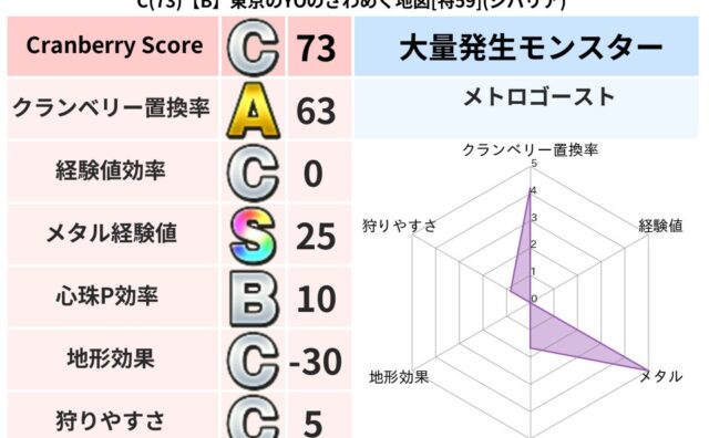 クランベリーボット判定結果の詳細クランベリースコア89クランベリー置換率64%大量発生モンスターメトロゴースト超耐性ジバリア(46%)超耐性・弱耐性なしドルマ系統狩りゾンビ系41%こころ道 完全一致モンスターがいこつ魔剣士(共通Lv1)ブラ...