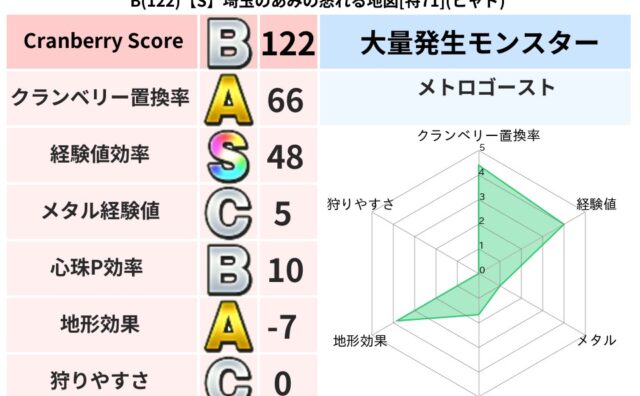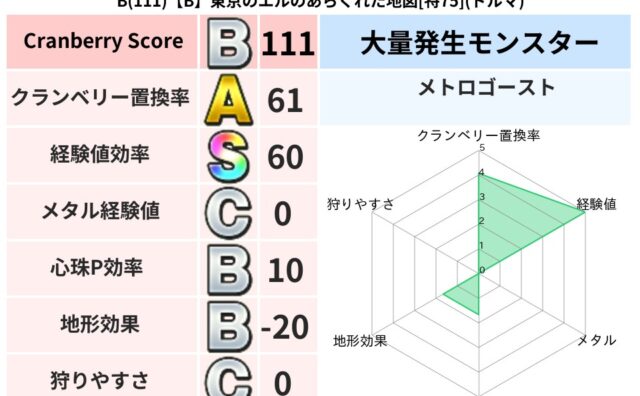 クランベリーボット判定結果の詳細クランベリースコア96クランベリー置換率61%大量発生モンスターメトロゴースト超耐性ドルマ(17%)こころ道 完全一致モンスタースカルガルードラゴン(竜道Lv5)かっちゅうアリ魔人(共通Lv1)つかいま大魔道...
