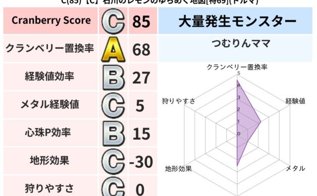 クランベリーボット判定結果の詳細クランベリースコア92クランベリー置換率69%大量発生モンスターつむりんママ超耐性メラ(82%)こころ道 完全一致モンスターみならいあくまニンジャ(風道Lv5)ヒートギズモ守り人(ささえ道Lv5)キースドラゴ...