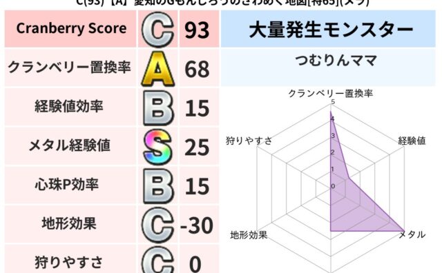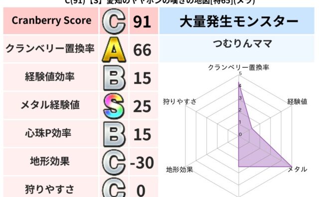 クランベリーボット判定結果の詳細クランベリースコア:121クランベリー置換率:66%大量発生モンスター:つむりんママメラ超耐性(55%)こころ道 完全一致モンスターキャットフライ: ニンジャ(共通Lv1)デビルアーマー: 大神官(舞道Lv5...