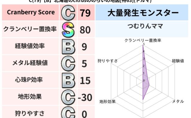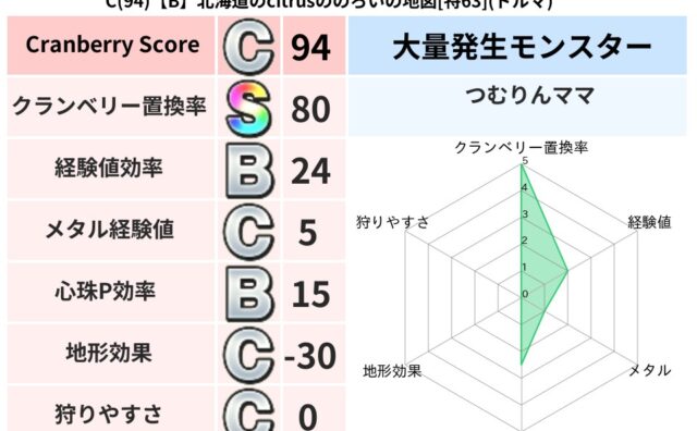 クランベリーボット判定結果の詳細クランベリースコア77クランベリー置換率62%大量発生モンスターつむりんママ超耐性ドルマ(80%)こころ道 完全一致モンスターだいまどうゴッドハンド(武道Lv40)ブラウニー守り人(共通Lv1)マミー魔剣士(...