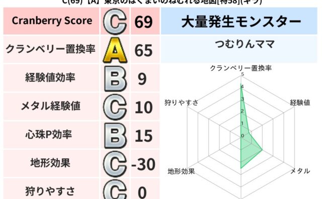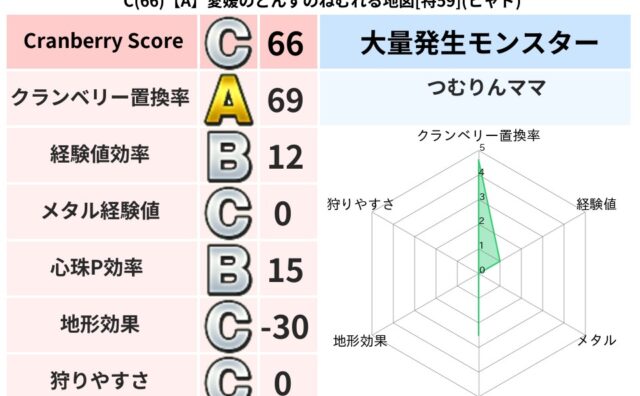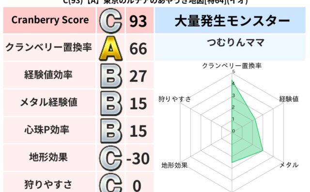 クランベリーボット判定結果の詳細クランベリースコア:93クランベリー置換率:66%大量発生モンスター:つむりんママイオ超耐性(51%)こころ道 完全一致モンスターしのどれいゴッドハンド(守護道Lv5),大魔導士(魔力道Lv5)ドロヌーバニン...