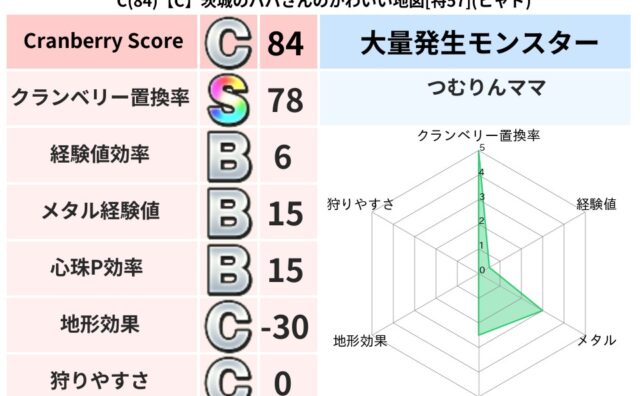 クランベリーボット判定結果の詳細クランベリースコア:93クランベリー置換率:62%大量発生モンスター:つむりんママデイン超耐性(0%)こころ道 完全一致モンスタージェリーマン: 魔剣士(魔道Lv5)アイアンクック: 守り人(まもり道Lv5)...