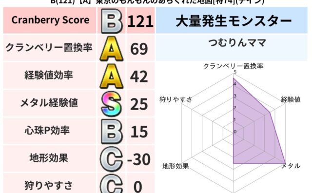 クランベリーボット判定結果の詳細クランベリースコア117クランベリー置換率78%大量発生モンスターつむりんママ超耐性ギラ(75%)こころ道 完全一致モンスターどくろあらいゴッドハンド(守護道Lv5)どくイモムシニンジャ(波道Lv5)ストーン...