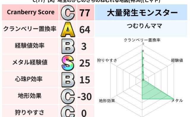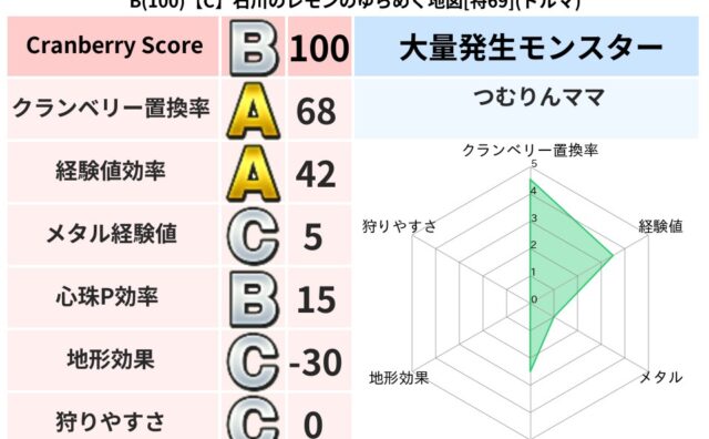 クランベリーボット判定結果の詳細クランベリースコア:100クランベリー置換率:68%大量発生モンスター:つむりんママドルマ超耐性(57%)こころ道 完全一致モンスターキメラ大魔導士(共通Lv1)がいこつ魔剣士(共通Lv1)ストーンマンゴッド...