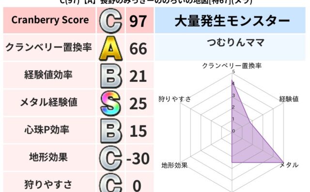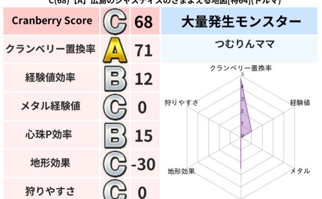 クランベリーボット判定結果の詳細クランベリースコア68クランベリー置換率71%大量発生モンスターつむりんママ超耐性ドルマ(51%)こころ道 完全一致モンスターだいまどうゴッドハンド(武道Lv40)キャタピラーニンジャ(風道Lv40)りゅうき...