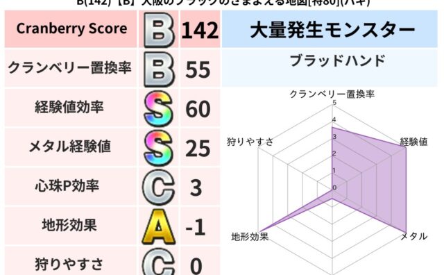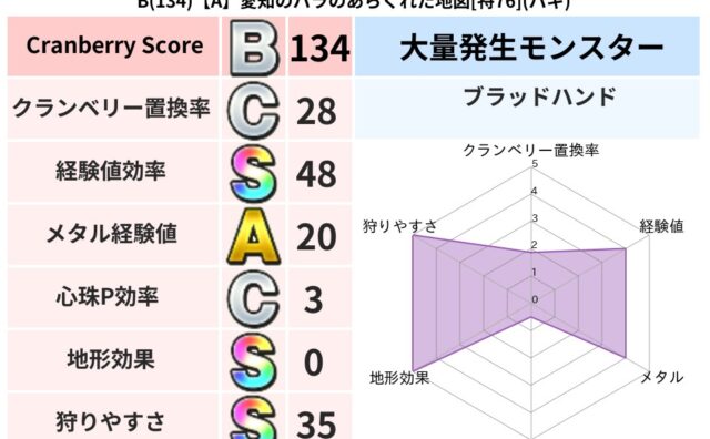 クランベリーボット判定結果の詳細クランベリースコア138クランベリー置換率38%大量発生モンスターブラッドハンド超耐性メラ(0%)超耐性・弱耐性なしジバリアこころ道 完全一致モンスターヘルボックル魔剣士(魔道Lv30)デビルアーマー大神官(...