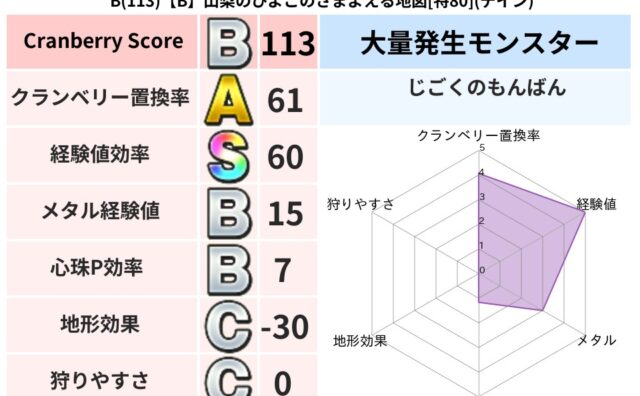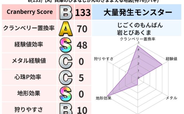 クランベリーボット判定結果の詳細クランベリースコア202クランベリー置換率79%大量発生モンスターじごくのもんばん,さそりばち超耐性バギ(0%)こころ道 完全一致モンスターストーンマンゴッドハンド(守護道Lv5)キースドラゴン大魔道士(理力...