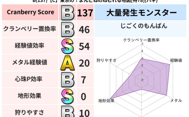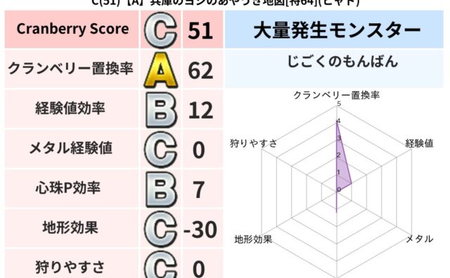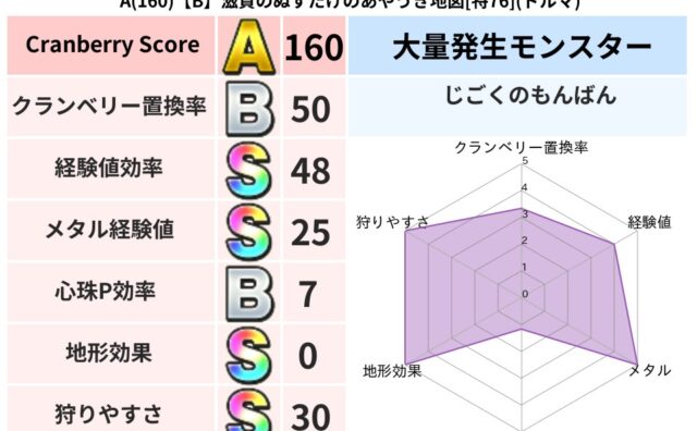 クランベリーボット判定結果の詳細クランベリースコア160クランベリー置換率50%大量発生モンスターじごくのもんばん超耐性ドルマ(0%)こころ道 完全一致モンスタードロヌーバニンジャ(波道Lv5)ベビーサラマンダ大神官(舞道Lv5)ガーディア...