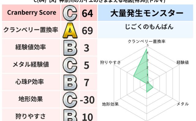 地図判定結果 C(64)【A】神奈川のカイエのさまよえる地図[特56](ドルマ) クランベリーボット判定結果の詳細クランベリースコア:64クランベリー置換率:69%大量発生モンスター:じごくのもんばんドルマ超耐性(49%)系統狩り(49%)こころ道 完全一致モンスターくさった死体ゴッドハンド(守護道Lv5),大魔導士(魔... 2024/04/25 18:14 地図判定結果