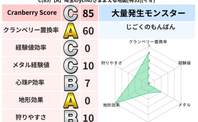 地図判定結果 C(85)【A】埼玉のychのさまよえる地図[特53](イオ) クランベリーボット判定結果の詳細クランベリースコア:85クランベリー置換率:60%大量発生モンスター:じごくのもんばんイオ超耐性(1%)系統狩り(40%)こころ道 完全一致モンスターキースドラゴン大魔導士(理力道Lv5)ジェリーマン魔剣士(... 2024/04/23 08:21 地図判定結果