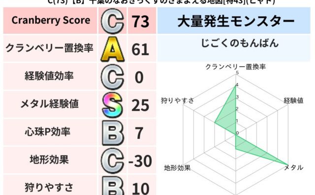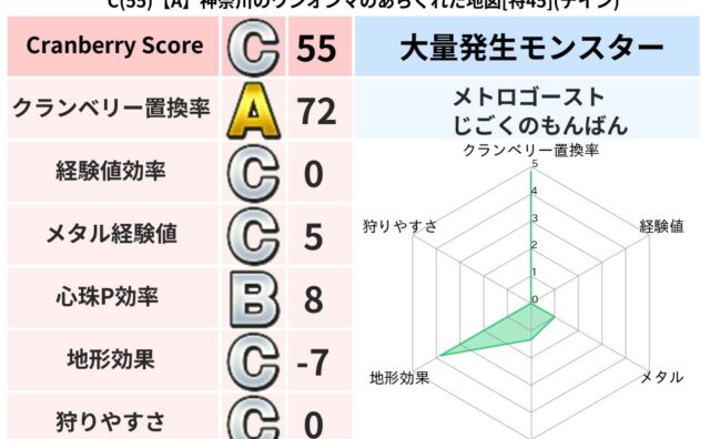 地図判定結果 C(78)【A】神奈川のワンオンマのあらくれた地図[特45](デイン) クランベリーボット判定結果の詳細クランベリースコア:78クランベリー置換率:72%大量発生モンスター:メトロゴースト,じごくのもんばんデイン超耐性(0%)こころ道 完全一致モンスターストーンマン: ゴッドハンド(守護道Lv5)キースドラゴン... 2024/04/25 00:39 地図判定結果