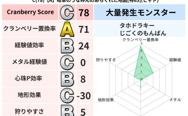 地図判定結果 C(78)【A】岐阜のうなみんのあらくれた地図[特63](ヒャド) クランベリーボット判定結果の詳細クランベリースコア:78クランベリー置換率:71%大量発生モンスター:タホドラキー,じごくのもんばんヒャド超耐性(49%)こころ道 完全一致モンスターデビルアーマー大神官(舞道Lv5)タホドラキードラゴン(人... 2024/05/01 08:05 地図判定結果