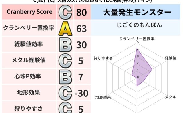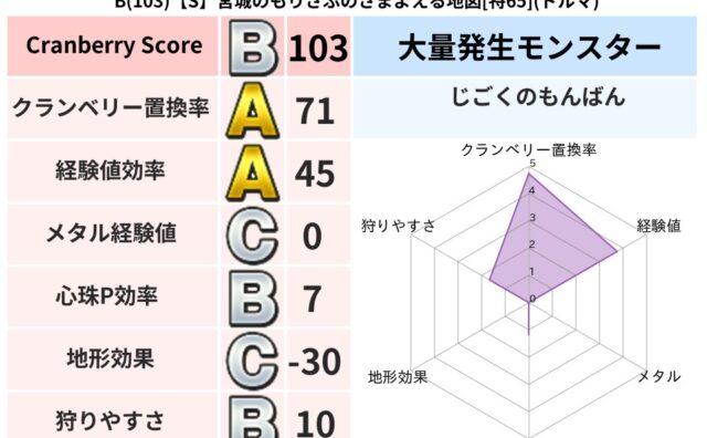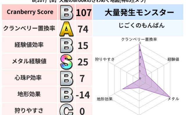 クランベリーボット判定結果の詳細クランベリースコア:93クランベリー置換率:67%大量発生モンスター:じごくのもんばん,メーダロードイオ超耐性(0%)こころ道 完全一致モンスターデビルアーマー: 大神官(舞道Lv5)ストーンマン: ゴッドハ...