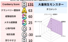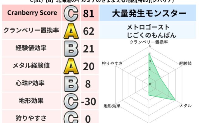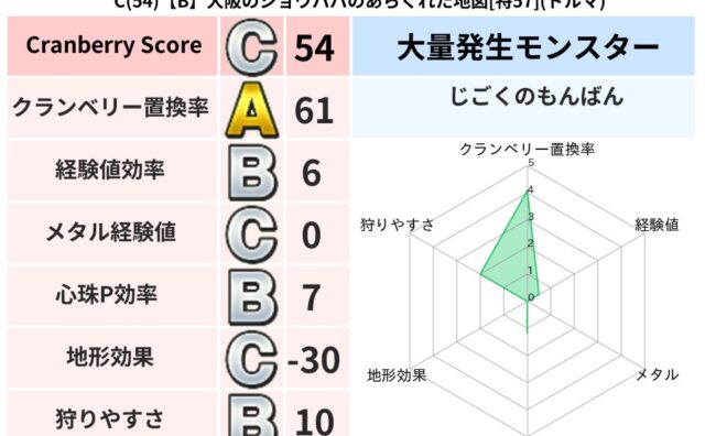 クランベリーボット判定結果の詳細クランベリースコア:58クランベリー置換率:63%大量発生モンスター:じごくのもんばんイオ超耐性(0%)こころ道 完全一致モンスターしのどれい: ゴッドハンド(守護道Lv5),大魔導士(魔力道Lv5)ベロニャ...
