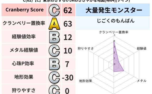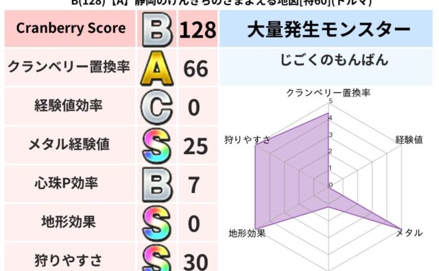 クランベリーボット判定結果の詳細クランベリースコア:125クランベリー置換率:63%大量発生モンスター:じごくのもんばんデイン超耐性(53%)系統狩り(61%)こころ道 完全一致モンスタージェリーマン: 魔剣士(魔道Lv5)グリゴンダンス:...