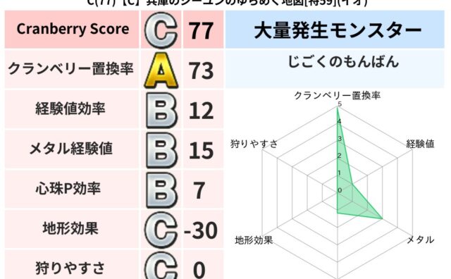 クランベリーボット判定結果の詳細クランベリースコア38クランベリー置換率61%大量発生モンスターじごくのもんばん超耐性ギラ(46%)こころ道 完全一致モンスタースカルガルードラゴン(竜道Lv5)ベビーサラマンダ大神官(舞道Lv5)ベビーマジ...