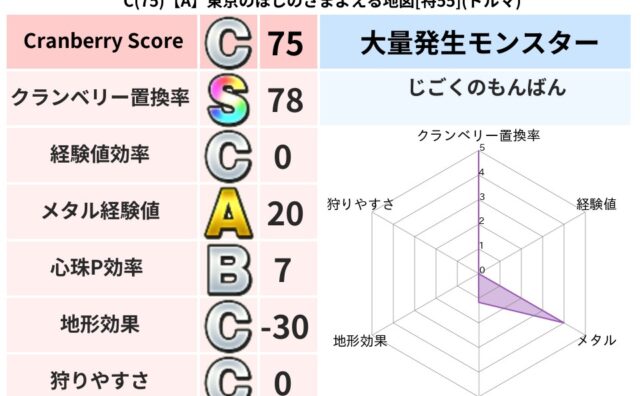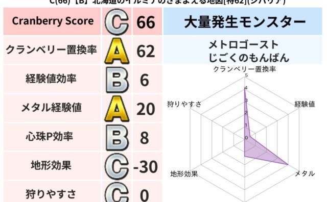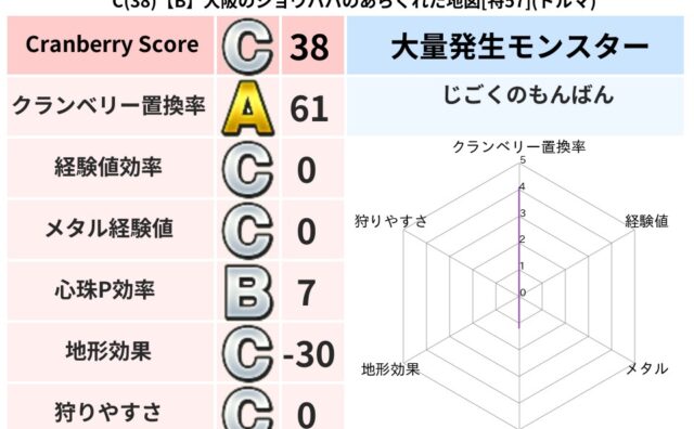 クランベリーボット判定結果の詳細クランベリースコア:58クランベリー置換率:63%大量発生モンスター:じごくのもんばんイオ超耐性(0%)こころ道 完全一致モンスターしのどれい: ゴッドハンド(守護道Lv5),大魔導士(魔力道Lv5)ベロニャ...