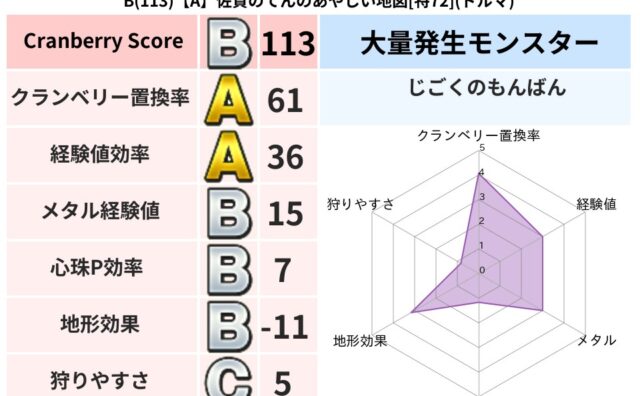 クランベリーボット判定結果の詳細クランベリースコア69クランベリー置換率62%大量発生モンスターじごくのもんばん超耐性メラ(60%)超耐性・弱耐性なしイオバギドルマこころ道 完全一致モンスターねこまどうニンジャ(風道Lv5)しりょうのきし大...