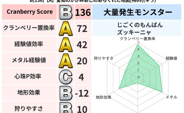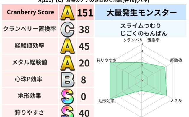 スコアA A(166)【C】茨城のナナのざわめく地図[特70](バギ) クランベリーボット判定結果の詳細クランベリースコア:166クランベリー置換率:38%大量発生モンスター:スライムつむり,じごくのもんばんバギ超耐性(0%)超耐性・弱耐性なし:イオ,ジバリア系統狩り(46%)こころ道 完全一致モンスタースカル... 2025/02/04 19:34 スコアA地図判定結果