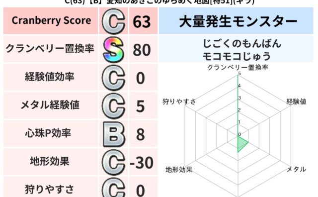 地図判定結果 C(63)【B】愛知のあきこのゆらめく地図[特51](ギラ) クランベリーボット判定結果の詳細クランベリースコア:63クランベリー置換率:80%大量発生モンスター:じごくのもんばん,モコモコじゅうギラ超耐性(43%)こころ道 完全一致モンスターストーンマンゴッドハンド(守護道Lv5)くさった死体ゴッド... 2025/03/08 20:46 地図判定結果置換率S