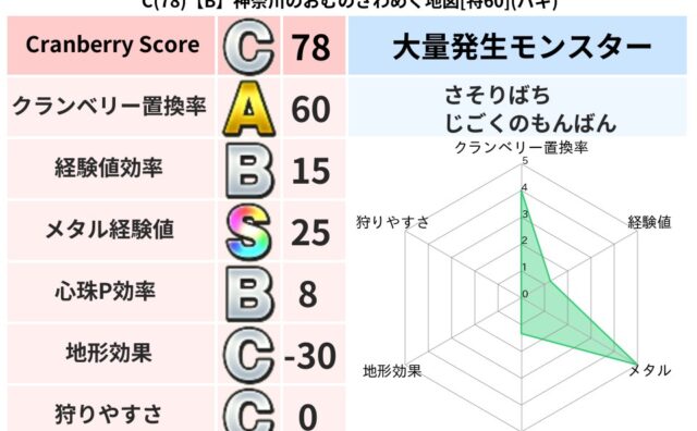 地図判定結果 C(93)【B】神奈川のおむのざわめく地図[特60](バギ) クランベリーボット判定結果の詳細クランベリースコア:93クランベリー置換率:60%大量発生モンスター:さそりばち,じごくのもんばんバギ超耐性(75%)こころ道 完全一致モンスターキャットフライ: ニンジャ(共通Lv1)ナイトキャット: 守り... 2025/03/14 14:41 地図判定結果