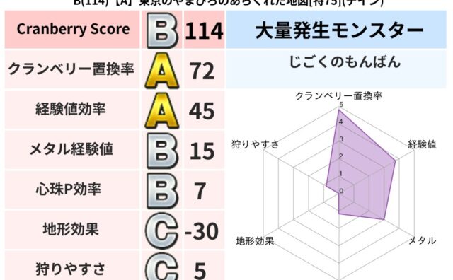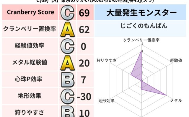 クランベリーボット判定結果の詳細クランベリースコア155クランベリー置換率46%大量発生モンスターじごくのもんばん超耐性イオ(0%)超耐性・弱耐性なしバギこころ道 完全一致モンスターどくろあらいゴッドハンド(守護道Lv5)くさった死体ゴッド...
