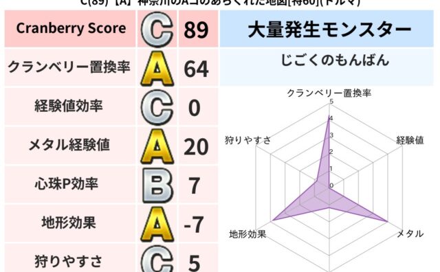 クランベリーボット判定結果の詳細クランベリースコア:113クランベリー置換率:71%大量発生モンスター:じごくのもんばんギラ超耐性(43%)超耐性・弱耐性なし:バギこころ道 完全一致モンスターストーンマンゴッドハンド(守護道Lv5)しのどれ...