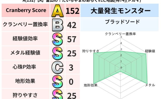 スコアA A(152)【A】富山の!たいちゃまのあらくれた地図[特74](ドルマ) クランベリーボット判定結果の詳細クランベリースコア152クランベリー置換率42%大量発生モンスターブラッドソード超耐性ドルマ(0%)超耐性・弱耐性なしイオバギデインこころ道 完全一致モンスターブラッドソード守り人(ささえ道Lv5)どくろあら... 2025/08/17 10:24 スコアA地図判定結果