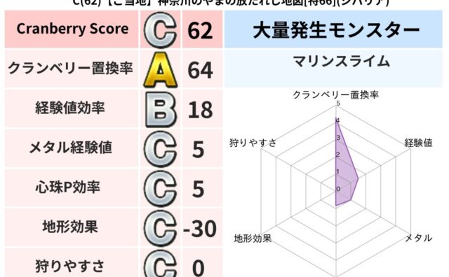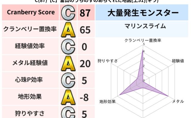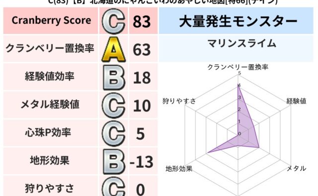 クランベリーボット判定結果の詳細クランベリースコア83クランベリー置換率68%大量発生モンスターマリンスライム超耐性ギラ(71%)こころ道 完全一致モンスターキメラ大魔道士(共通Lv1)シャドーニンジャ(波道Lv30)ストーンマンゴッドハン...