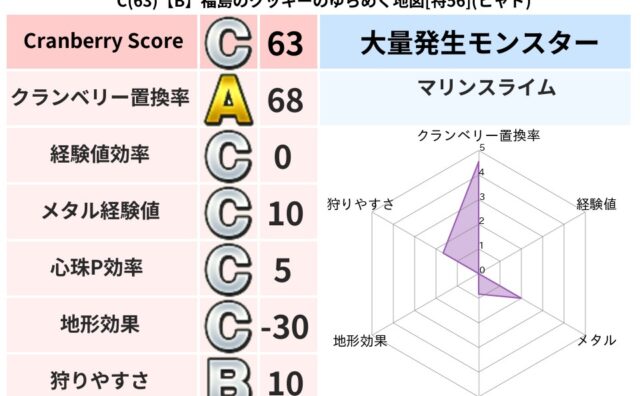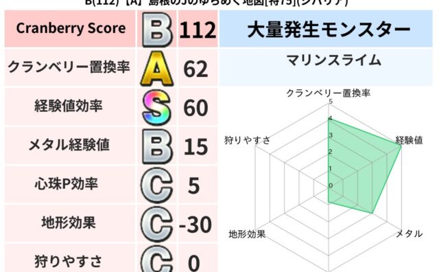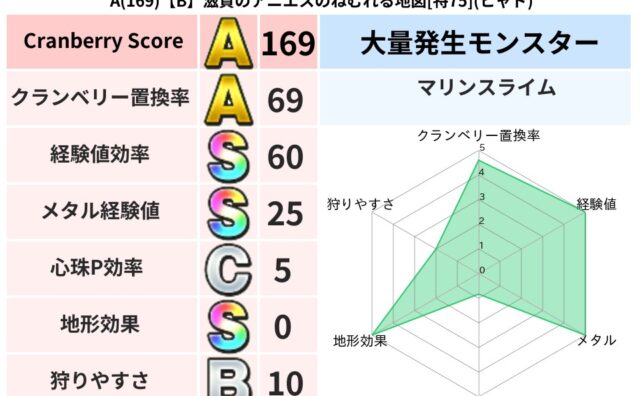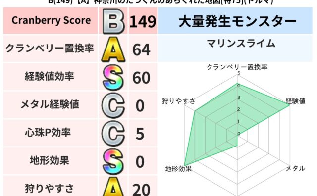 クランベリーボット判定結果の詳細クランベリースコア154クランベリー置換率69%大量発生モンスターマリンスライム超耐性ヒャド(0%)こころ道 完全一致モンスターブラウニー守り人(共通Lv1)ストーンマンゴッドハンド(守護道Lv5)デンタザウ...
