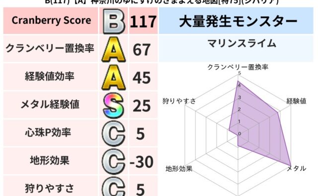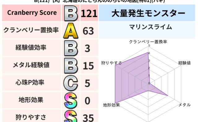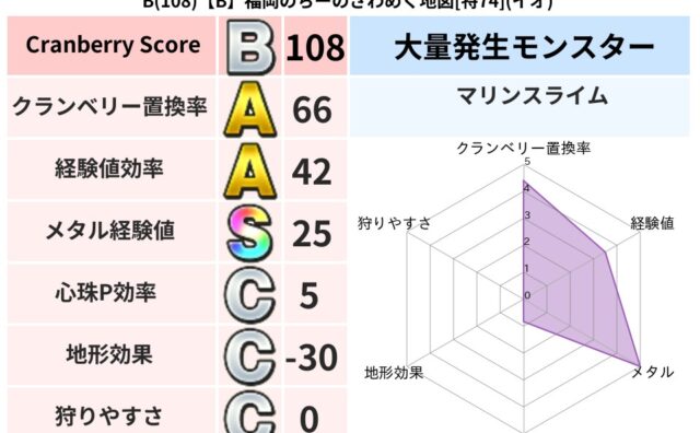 クランベリーボット判定結果の詳細クランベリースコア:86クランベリー置換率:61%大量発生モンスター:マリンスライムドルマ超耐性(52%)こころ道 完全一致モンスターさまようよろいゴッドハンド(守護道Lv5)かっちゅうアリ魔人(共通Lv1)...