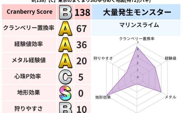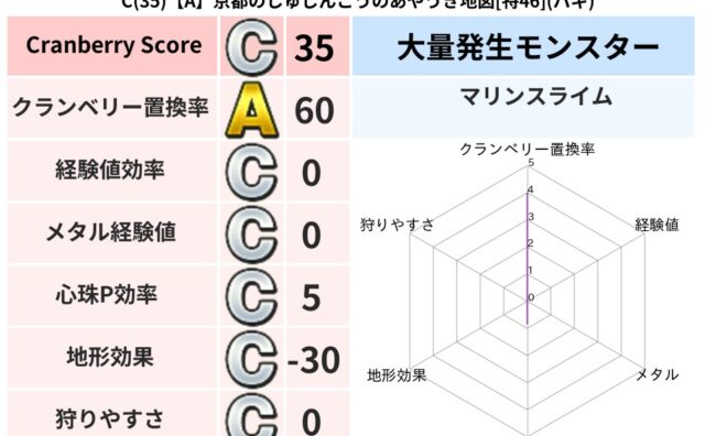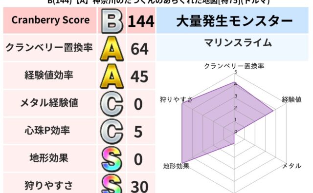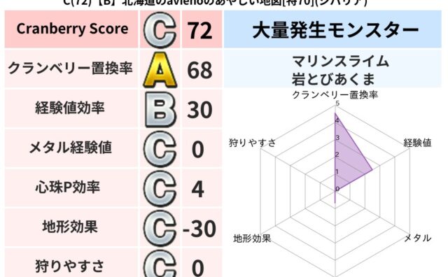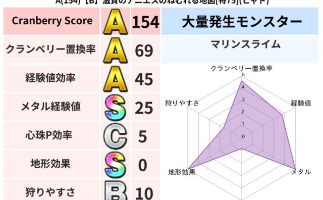 クランベリーボット判定結果の詳細クランベリースコア154クランベリー置換率59%大量発生モンスターモコモコじゅう,マリンスライム超耐性ジバリア(0%)こころ道 完全一致モンスターキャットフライニンジャ(共通Lv1)キースドラゴン大魔道士(理...