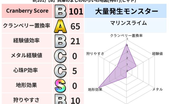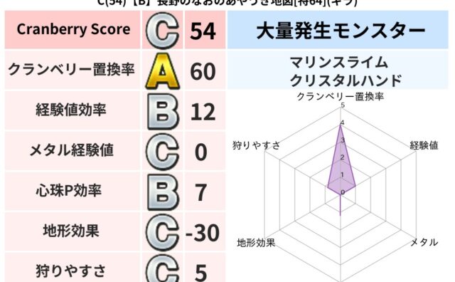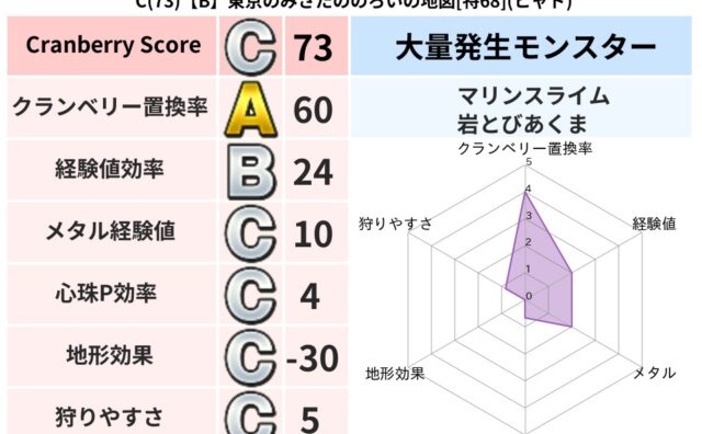 クランベリーボット判定結果の詳細クランベリースコア:69クランベリー置換率:60%大量発生モンスター:マリンスライム,クリスタルハンドギラ超耐性(50%)超耐性・弱耐性なし:デインこころ道 完全一致モンスターどくろあらいゴッドハンド(守護道...