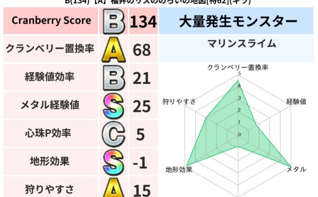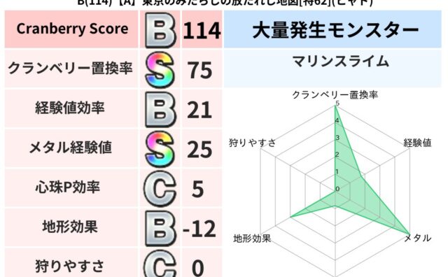 クランベリーボット判定結果の詳細クランベリースコア114クランベリー置換率75%大量発生モンスターマリンスライム超耐性ヒャド(10%)こころ道 完全一致モンスターデビルアーマー大神官(舞道Lv5)キースドラゴン大魔道士(理力道Lv5)だいま...