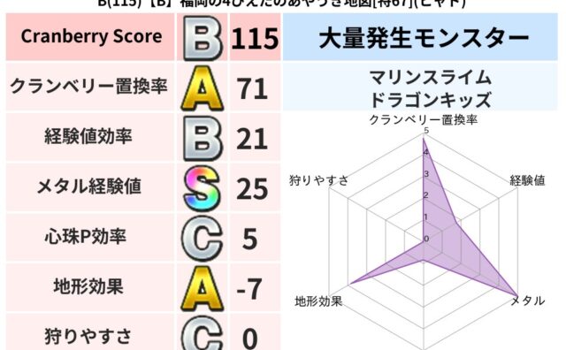 クランベリーボット判定結果の詳細クランベリースコア:65クランベリー置換率:61%大量発生モンスター:マリンスライムイオ超耐性(53%)系統狩り(42%)こころ道 完全一致モンスターストーンマンゴッドハンド(守護道Lv5)さまようよろいゴッ...